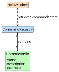 name — the command word (e.g. add, delete)description — the expected argument format (e.g. INDEX [--name NAME]...)example — an optional usage example shown below the descriptionWhen the help window is opened, HelpWindow#buildHelpText() iterates over CommandRegistry#getCommands()
