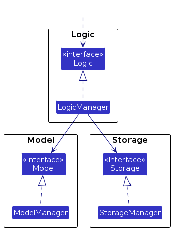 interface with the same name as the Component.{Component Name}Manager class (which follows the corresponding API interface mentioned in the previous point.For example, the Logic component defines its API in the Logic.java interface and implements its functionality using the LogicManager.java class which follows the Logic interface. Other components interact with a given component through its interface rather than the concrete class (reason: to prevent outside component's being coupled to the implementation of a component), as illustrated in the (partial) class diagram below.