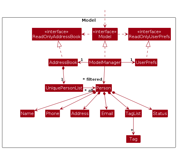 Person objects (which are contained in a UniquePersonList object).Person objects (e.g., results of a search query) as a separate filtered list which is exposed to outsiders as an unmodifiable ObservableList<Person> that can be 'observed' e.g. the UI can be bound to this list so that the UI automatically updates when the data in the list change.UserPref object that represents the user’s preferences. This is exposed to the outside as a ReadOnlyUserPref objects.Model represents data entities of the domain, they should make sense on their own without depending on other components)API : Storage.java