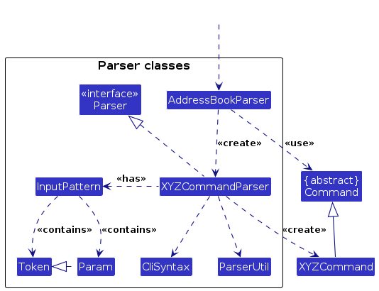 AddressBookParser object. It checks the first word of the command (known as the command word), and based on that, creates a parser that matches the command (e.g., DeleteCommandParser) and uses it to parse the command.Command object (more precisely, an object of one of its subclasses e.g., DeleteCommand) which is executed by the LogicManager.Model when it is executed (e.g. to delete a person).Model) to achieve.CommandResult object which is returned back from Logic.The following is a (partial) class diagram for the parser